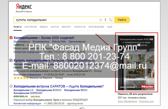 РПК «Фасад Медиа Групп» разместило рекламу в сети Интернет. Рекламное объявление было размещено в Яндекс.Директе. Макет и настройку рекламы производили специалисты нашей компании. Для получения коммерческого предложения по рекламе в Яндекс.Директе обращайтесь в РПК «Фасад Медиа Групп». Будем рады сотрудничеству